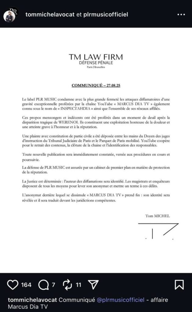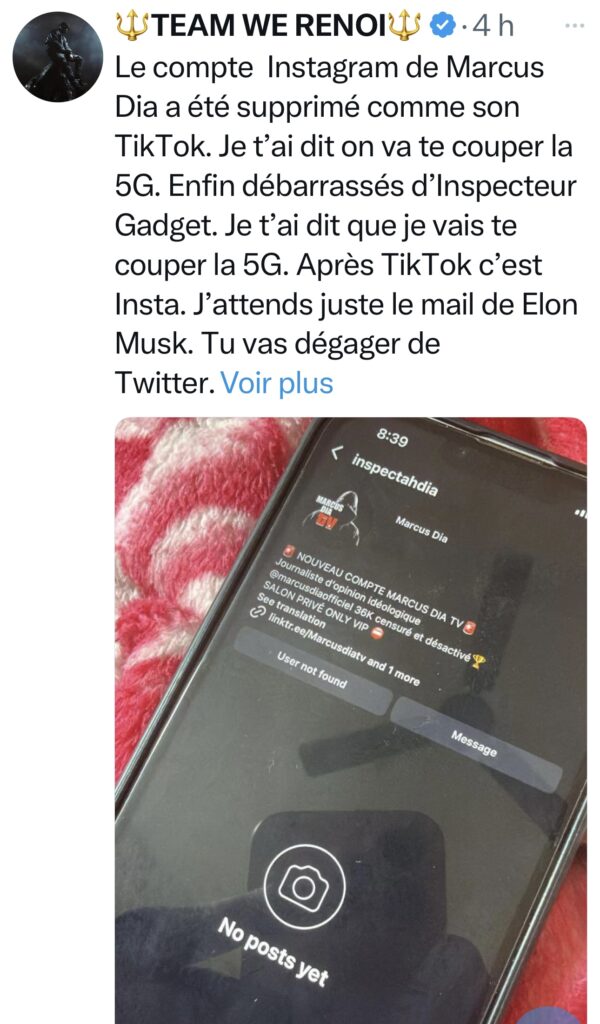 Nous avions suivi de près cette affaire explosive, publiant plusieurs vidéos analysant les tenants et aboutissants, avec des témoignages directs de Fatima B qui déclarait être victime de fausses accusations en plus d’avoir été passé à tabac. Ce travail journalistique nous a valu des pressions intenses : cyberharcèlement, menaces d’avocats et la suppression illégale de plusieurs de nos comptes sur Instagram, Facebook et TikTok. Ces actes ont été revendiqués par un certain Ivoiroi, se présentant comme community manager du label PLR Music, affilié à Babiri Sacko dit Babs.